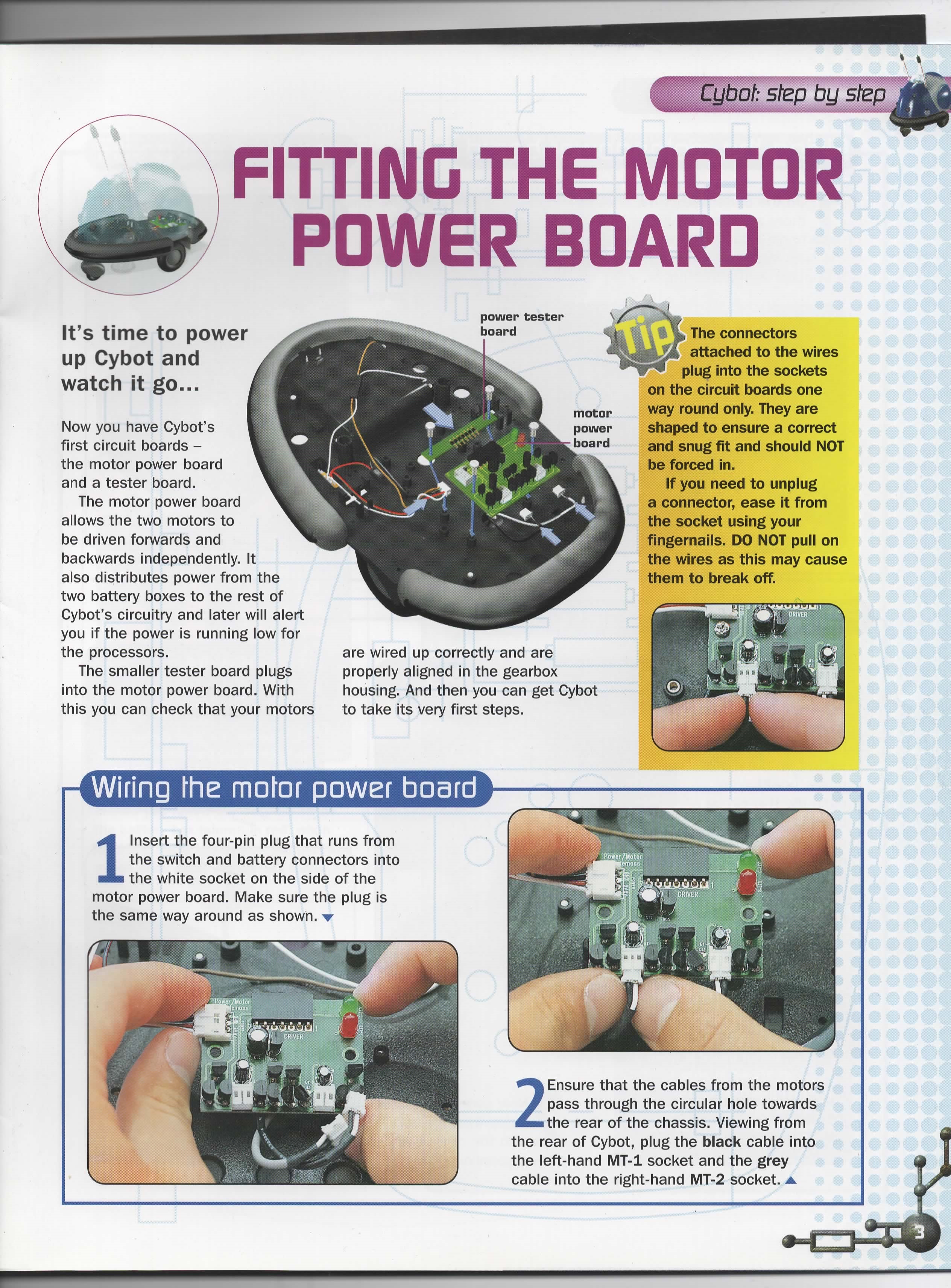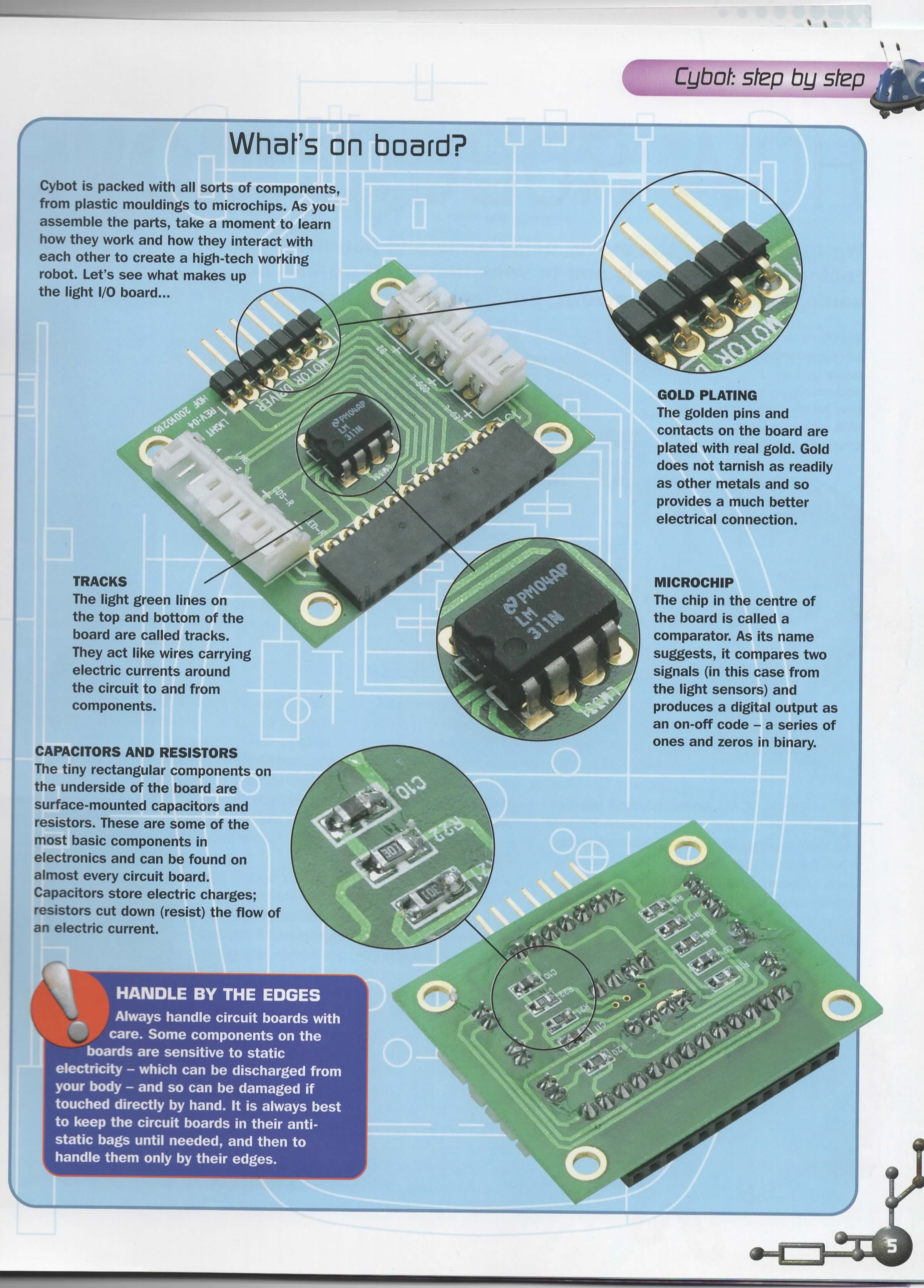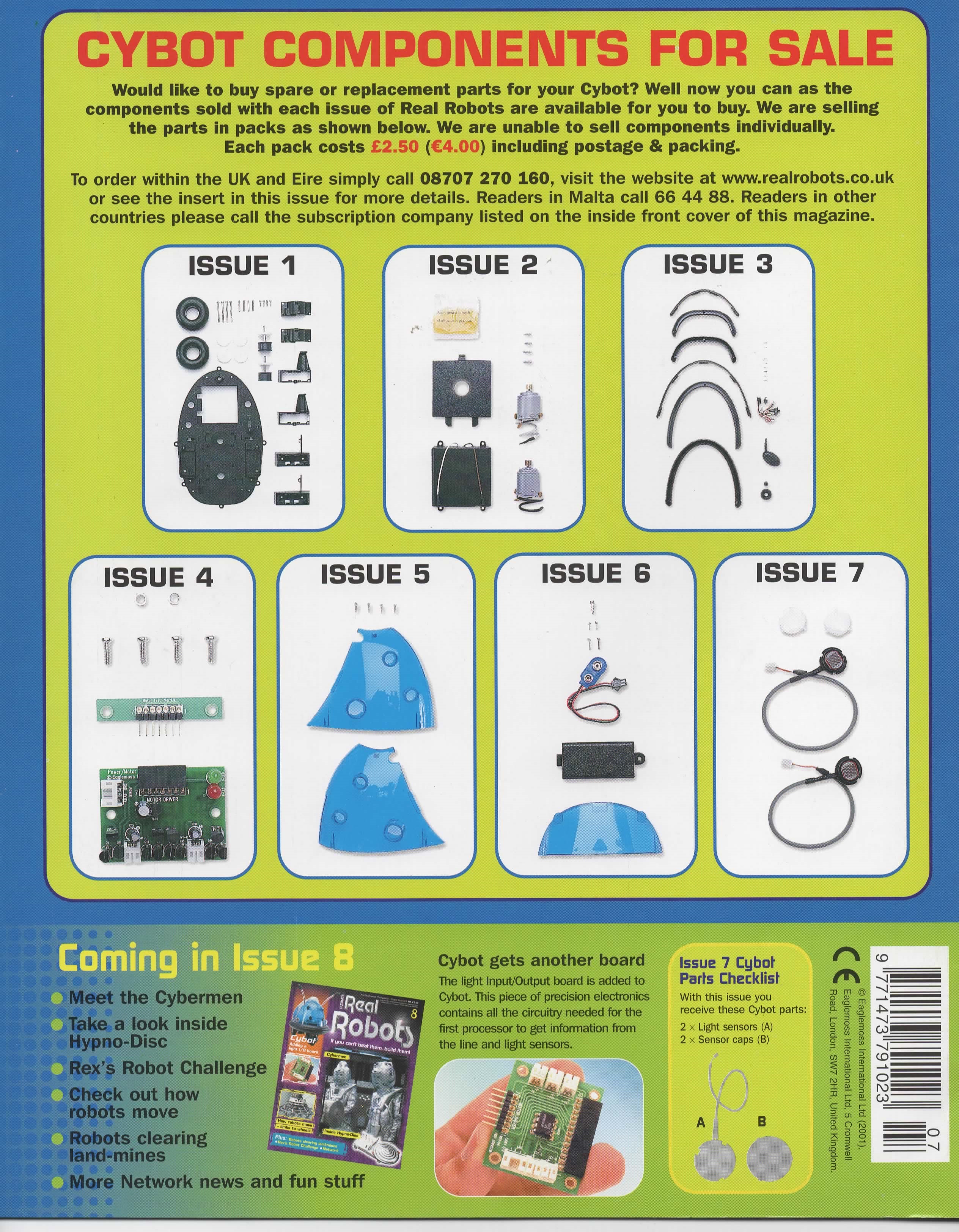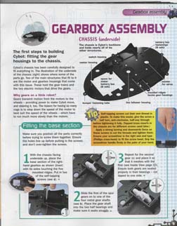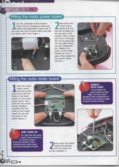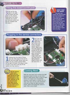 The Motor Driver Board that comes with this issue consists of two H-bridge circuits and a 5v regulator circuit with power on and low battery LED's. There is a good description by Nigel Goodwin on his Cybot Technical wensite.