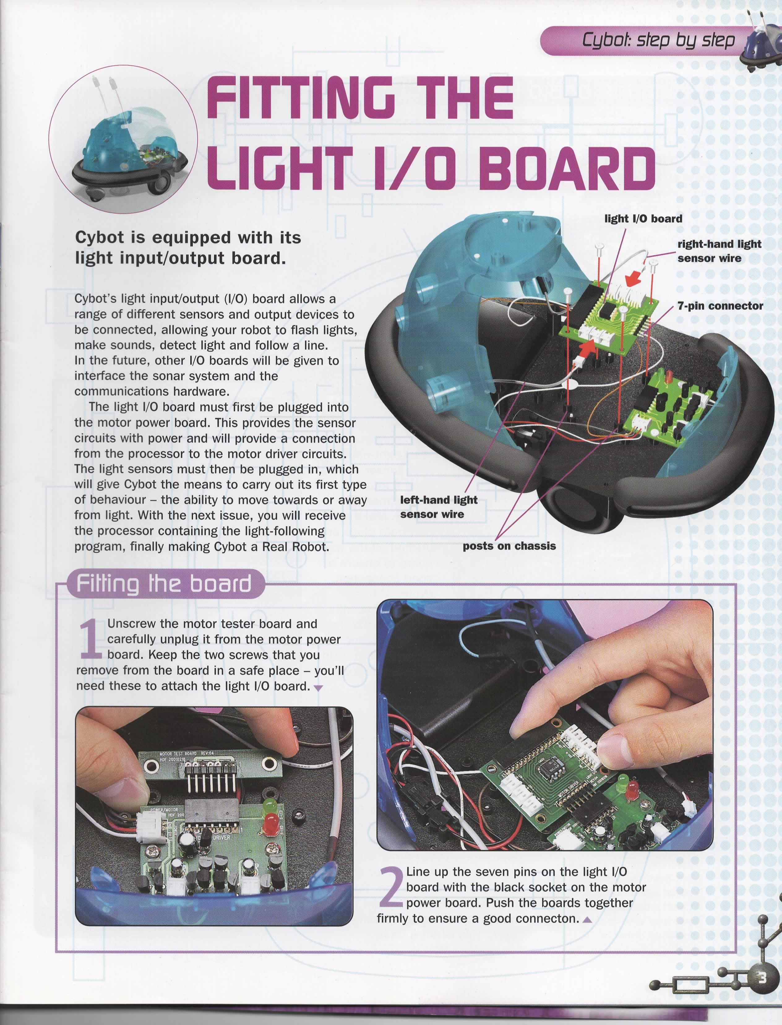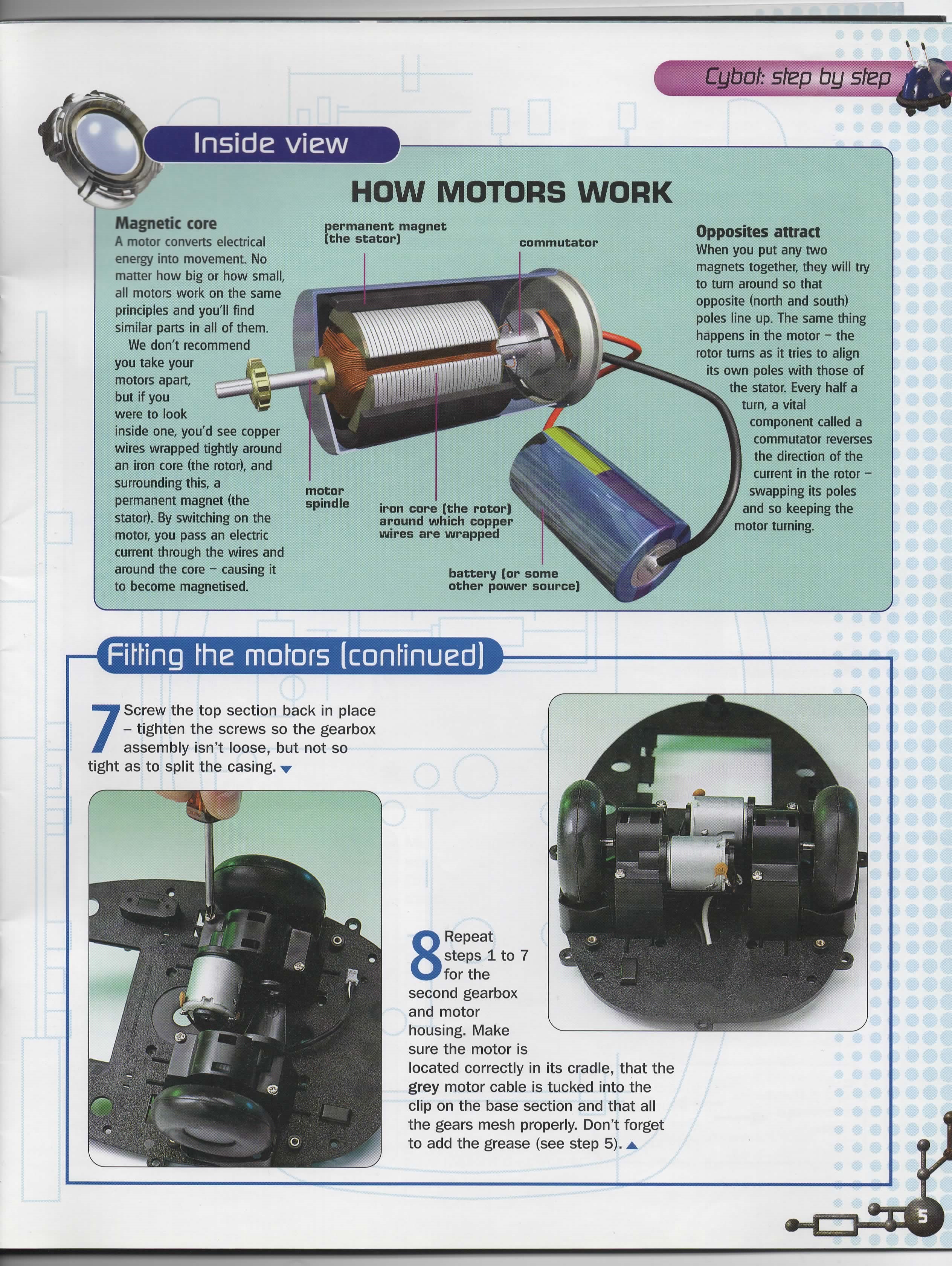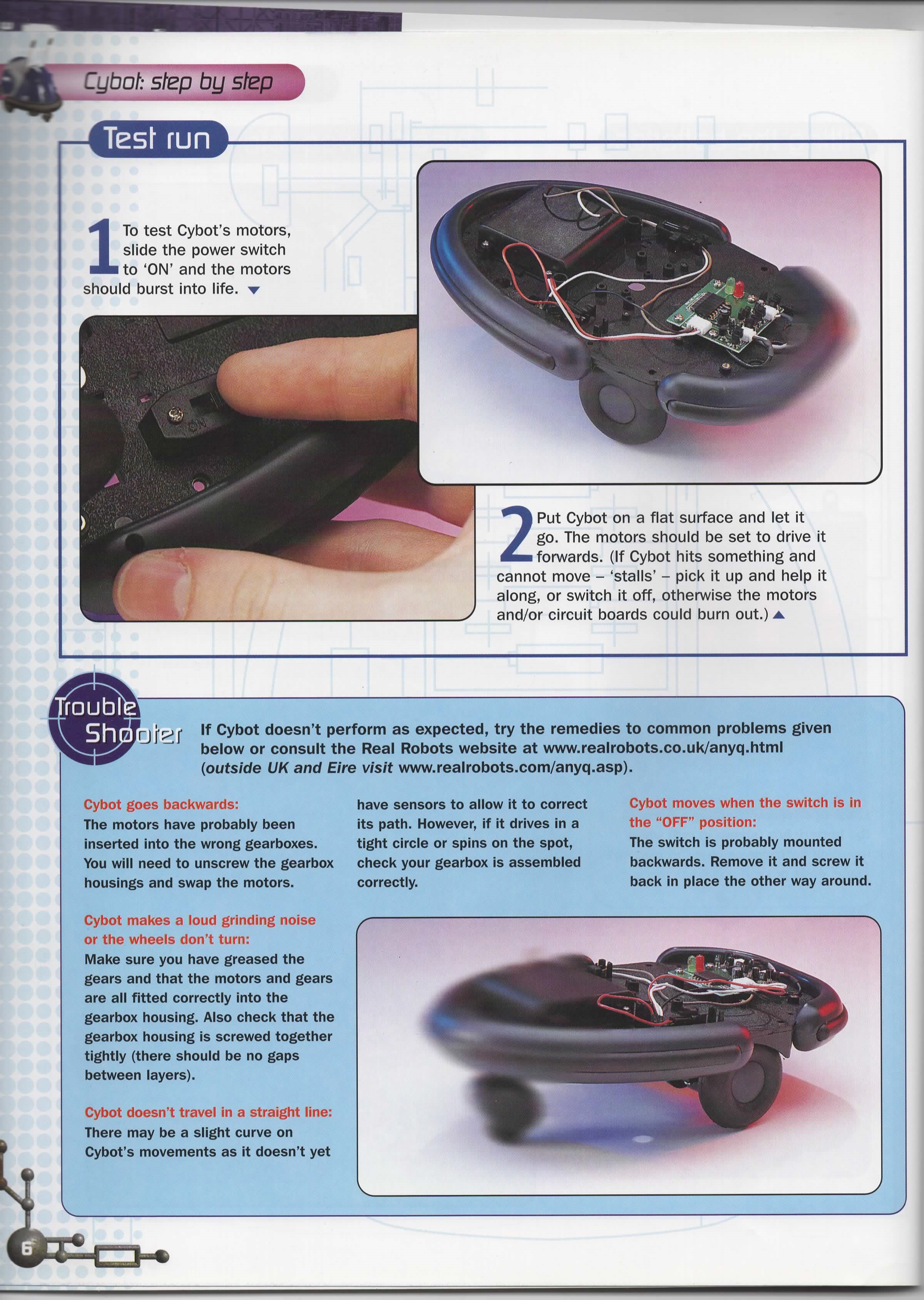 The Motor Driver Board that comes with this issue consists of two H-bridge circuits and a 5v regulator circuit with power on and low battery LED's. There is a good description by Nigel Goodwin on his Cybot Technical wensite.
