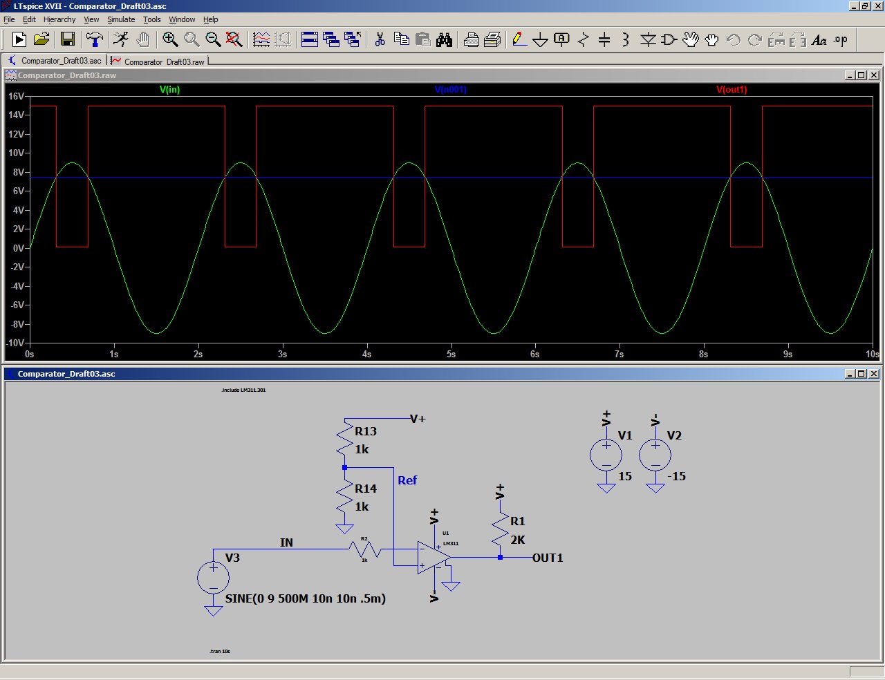 The Light I/O Board that came with issue 8 also has a good description by Nigel Goodwin on his web site " A Cybot Technical Site". The board has an LM311 comparitor circuit that is used with later additions to Cybot in a line following mode. I built a similar circuit in LTSpice. In the picture below the green trace is the input from V3, the blue trace is the Ref voltage into the comparators +ve input. When the input on the comparators -ve input rises above this level the output voltage drops to 0 volts, as can be seen on the red output trace.